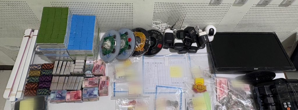 台北市萬華警分局日前破獲一處以棋牌社掩護的地下職業麻將賭場,當場查獲何姓現場負責人、工作人員及賭客共三十人,查扣賭資新台幣六萬三千餘元。該賭場為規避查緝,不僅設有逃生梯,更裝設多達十三支監視器,警方經長期蒐證後持搜索票一舉查緝到案。
