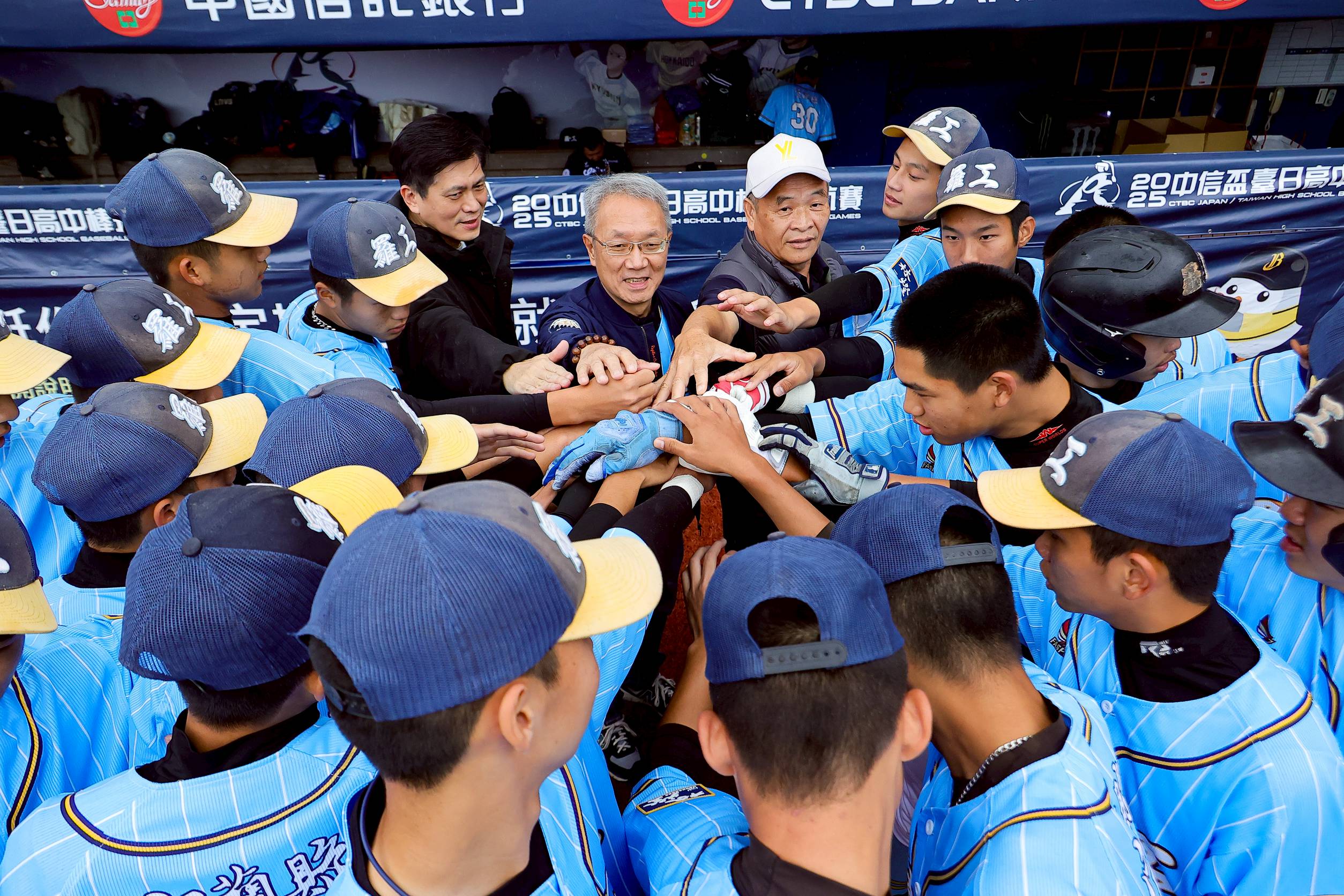 台日高中棒球對抗賽二十七日下午由羅東高工對上日本九州聯隊。代理縣長林茂盛為代表臺灣出征的羅東高工棒球隊加油打氣。(宜蘭縣政府提供)