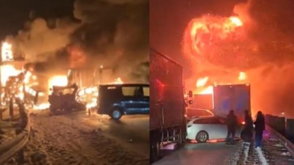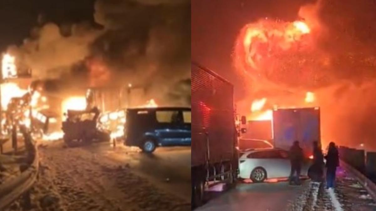 事發過後的二十七日凌晨時分,現場仍瀰漫著燒焦味,燒得焦黑的車輛冒出陣陣濃煙。中央分隔島嚴重彎曲,還有一輛車頭凹陷的卡車。地面則覆蓋著積雪。