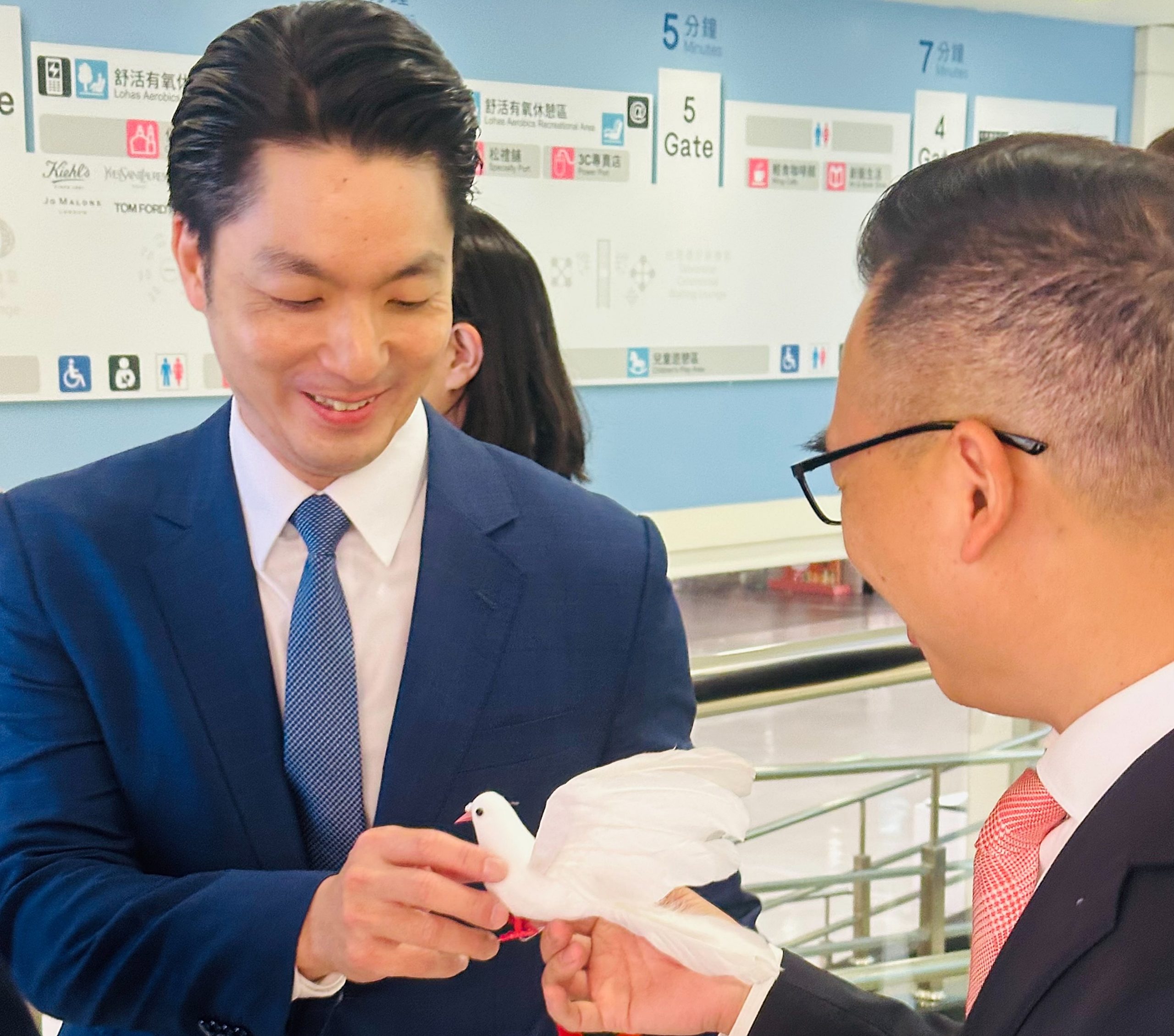 台北市長蔣萬安二十八日搭機前往上海參加雙城論壇,桃園市上海同鄉會理事長游智彬也隨機現場直播,在機場前將預先準備好的和平鴿致贈給蔣萬安市長,希望蔣市長在論壇中能將桃園市民希望和平的想法傳遞給對岸,游智彬說:「我以象徵和平與希望的白色和平鴿相贈,寓意兩岸人民、兩岸同胞共同期待和平與交流更平安。」
