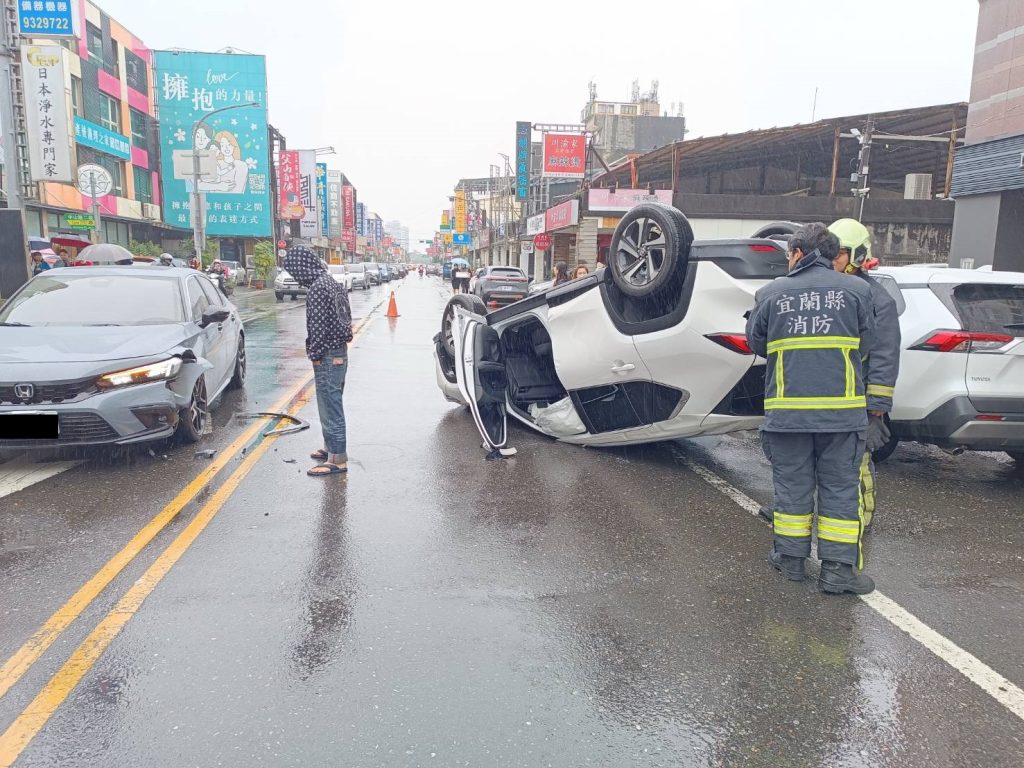 警方表示,白色豐車休旅車從宜蘭市宜興路開往中山路二段,轉彎速度並不快,但不知為何偏移中線,撞上對向的藍色自小客車,肇事白色休旅車瞬間翻覆。當時有用路人行車紀錄器錄到事發過程,懷疑是否閃神未留意,加上天雨路滑,才會撞到翻車、四輪朝天。