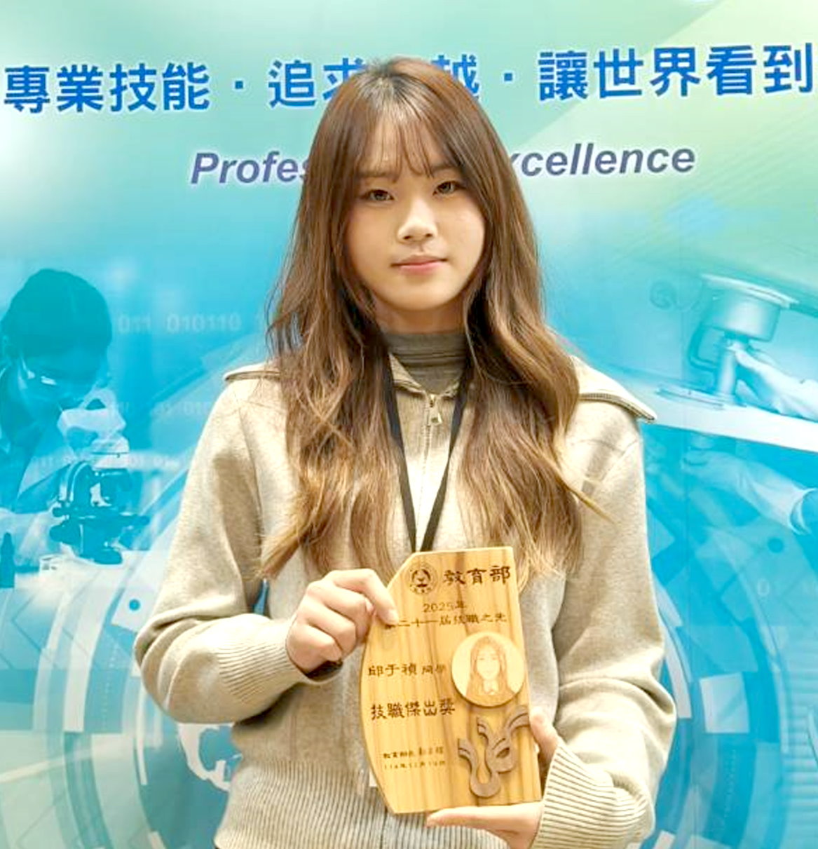畢業於能仁家商、現就讀台南應用科大美容造型設計系的邱于禎,憑其長期耕耘、傾力拚搏的學習態度與累積成果,除以美容、美甲等十三張專業證照,榮獲教育部第廿一屆「技職之光」,亦獲得韓國仁川二0二五國際美容技能大賽雙金,展現專業與創意實力。