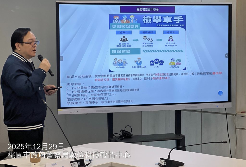 警方也宣導「民眾檢舉車手獎勵核發原則」,該制度自7月上路,民眾若提供具體線索協助警方查獲詐欺車手,經檢察官裁定處分後,可獲1萬元獎金。然而桃園市迄今僅核發6件,與案件量存在落差,警方呼籲民眾踴躍檢舉,共同打擊詐騙犯罪。