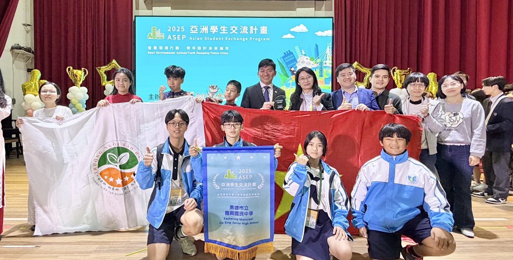 高雄市立嘉興國中與越南河內星星中學跨國合作組隊,參與「二0二五亞洲學生交流計畫」,以「青年設計未來城市」為主題,融合科技創意與永續行動,從八十五所亞洲參賽學校中脫穎而出,勇奪大會最高榮譽「白金獎」,展現臺灣學子卓越的國際合作力與前瞻視野,再次讓世界看見臺灣、看見嘉興。