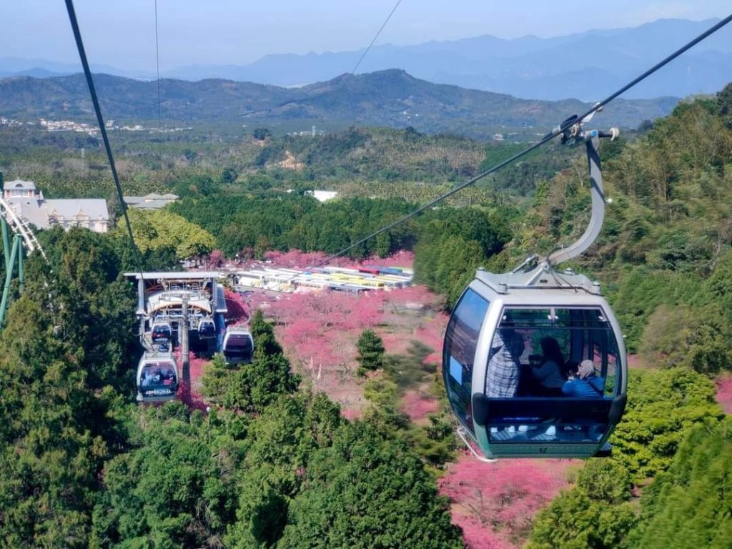 第二天早餐後,搭乘日月潭纜車展開空中之旅,全長一千八百七十七公尺、離地高達一百四十二公尺的纜車,串連伊達邵與九族文化村,從空中俯瞰碧綠湖水與山巒雲霧交織的絕美景色。抵達九族文化村後,欣賞年度盛事「櫻花祭」,園區栽種逾五千株櫻花,包括八重櫻、吉野櫻、富士櫻與自創新品「九族百重櫻」,園內櫻花湖、觀山樓與櫻花彩虹步道皆是熱門拍照點,浪漫氛圍媲美日本櫻花名所。午後自由遊園,體驗歡樂世界的遊樂設施或部落文化展演,結束後快樂賦歸。