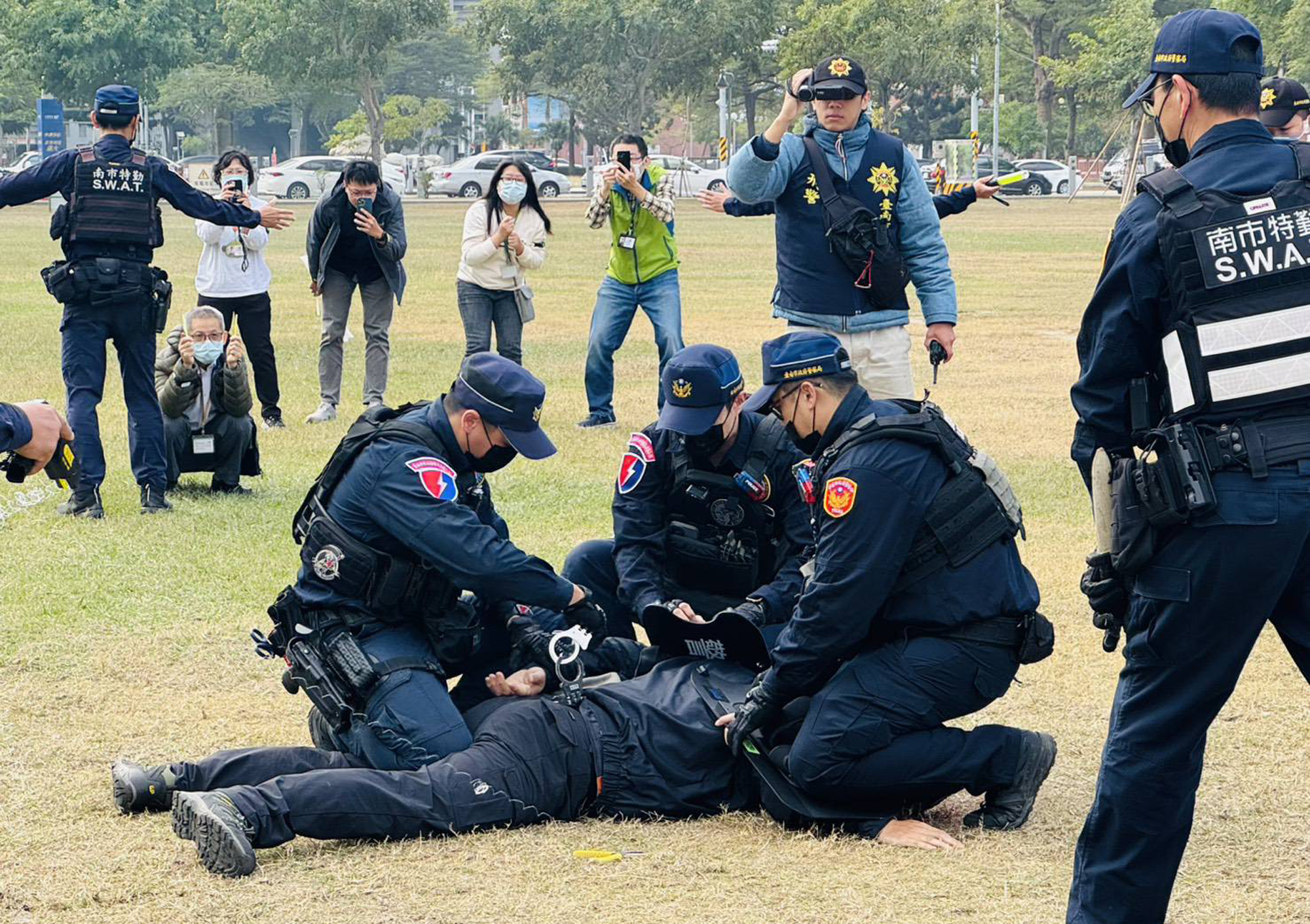 台南市政府警察局因應台北市近期隨機襲擊事件,為強化跨年晚會維安工作,二十九日在永華市政中心西側廣場舉辦維安演練,模擬歹徒丟擲煙霧彈及持刀衝入人群,場地充斥尖叫聲及彩色煙霧,演練過程逼真。