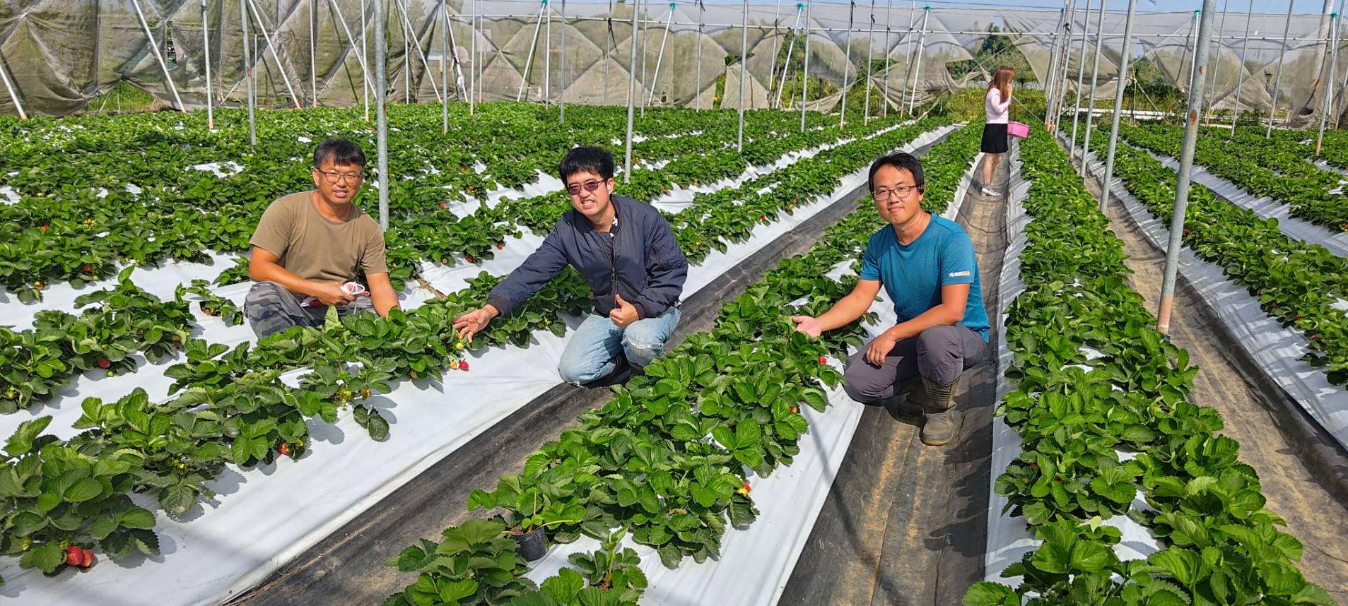 歸仁區栽種草莓的青農林文獻(左起)、彭耀緯、周邑駿歡迎消費者到場採草莓。(記者黃文記攝)