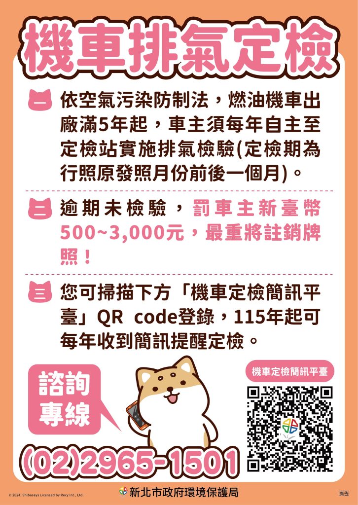 環保局再次呼籲,出廠滿5年的燃油機車應於行照發照月前後一個月內完成年度排氣檢驗。逾期未檢將依《空氣污染防制法》處新臺幣500元罰鍰,逾期6個月再罰3,000元,最重將註銷牌照。為響應節能減碳,自115年1月1日起,機車排氣定檢通知將全面電子化,停止寄發紙本明信片,改以簡訊通知提醒車主定檢期限。民眾只需至「新北市機車定檢簡訊平臺」(網址:https://motor.ntpc.gov.tw/sms)輸入車號及手機號碼,即可每年定檢期前收到提醒,同一手機號碼亦可綁定多組車號,輕鬆管理家中機車,避免遺忘受罰。