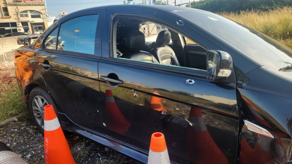 東港警分局專案小組人員連開四十二槍圍捕非法擁有槍彈的李姓男子,李男的自小客車因此彈痕累累。(記者鄭伯勝翻攝)