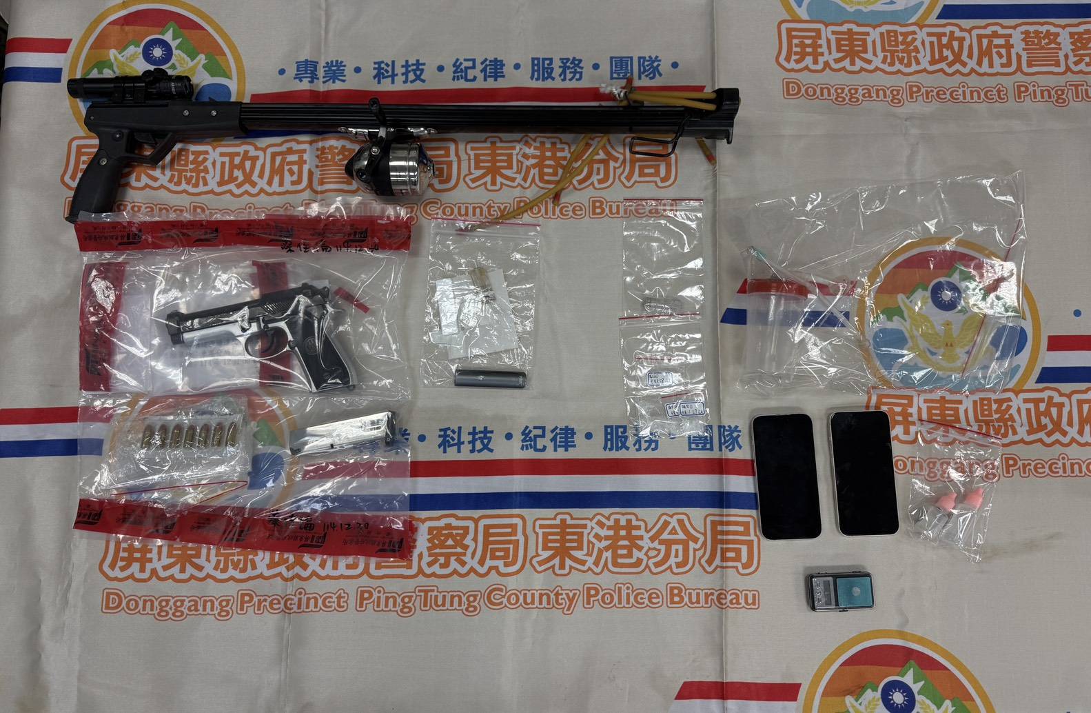 東港警分局專案小組人員逮捕李姓嫌犯後經多處搜索,起獲李嫌所藏匿的槍彈及毒品。(記者鄭伯勝翻攝)