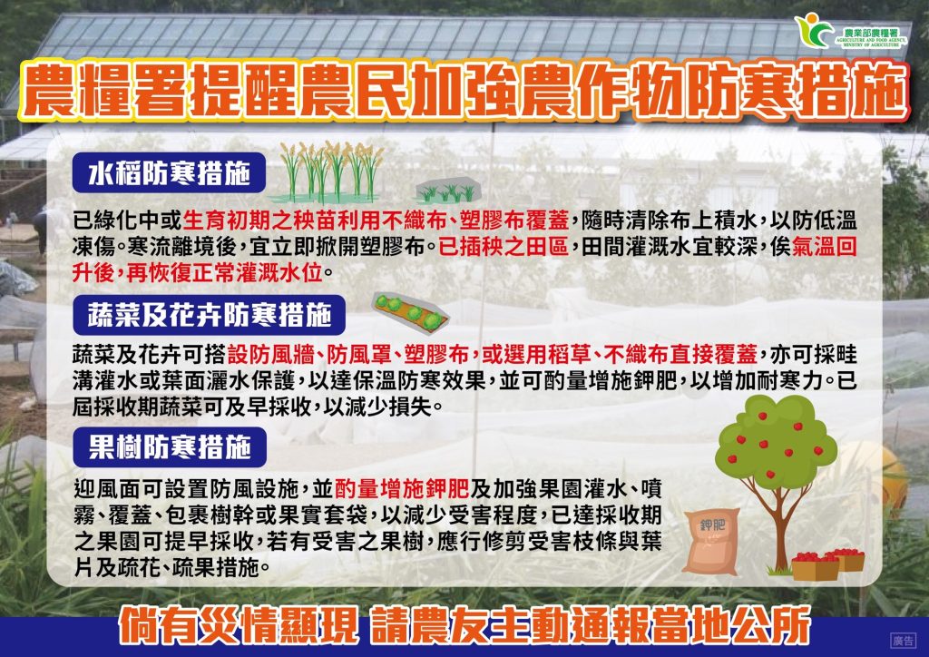 較不耐寒蔬菜與瓜果類,應設置防風牆、防風罩、塑膠布或選用稻草、不織布直接覆蓋,亦可採畦溝灌水或葉面灑水方式,以達保溫防寒效果,已屆採收期蔬菜可及早採收,以減少損失;花卉部分,除強化塑膠棚溫室等設施外,可採畦溝灌溉或以塑膠布直接覆蓋,以達保溫防寒效果,並可酌量增施鉀肥,以增加耐寒力。