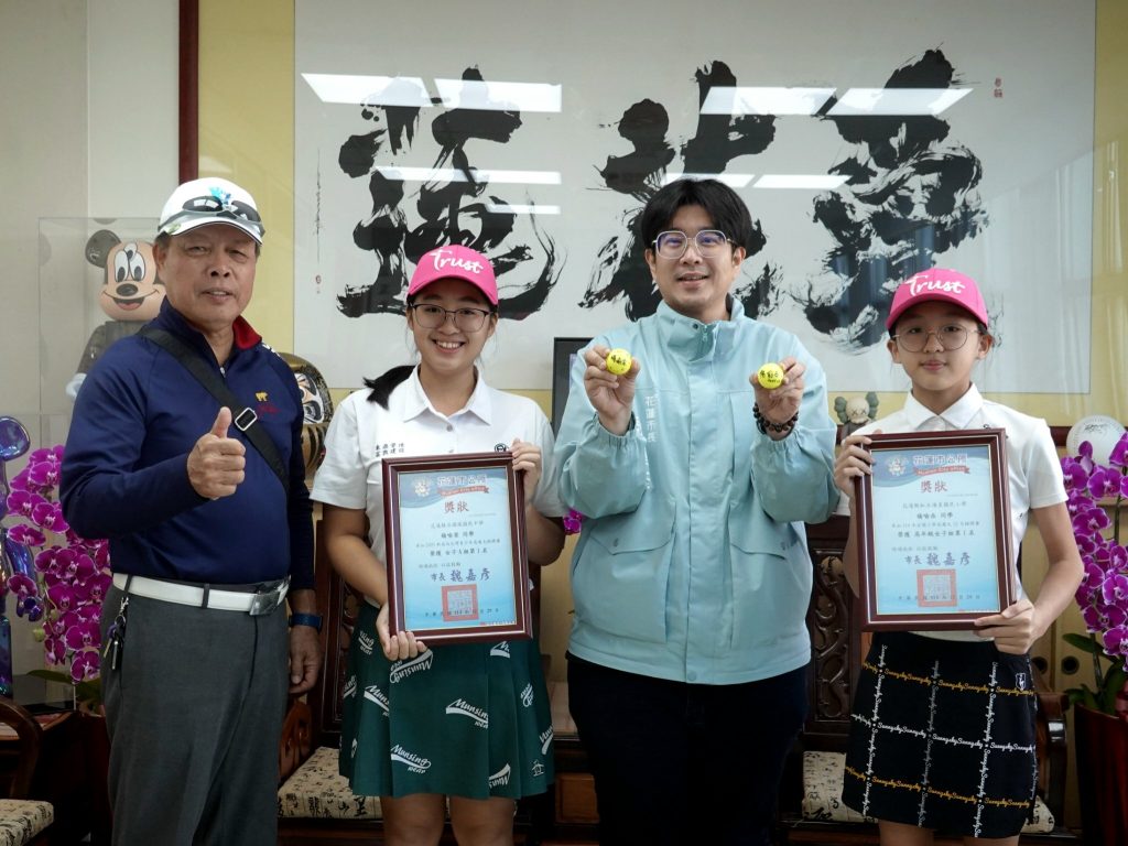 花蓮市高爾夫球小將在全國及國際賽事中表現亮眼,榮獲全國小學高爾夫錦標賽高年級女生組個人冠軍的楊喻丞,以及在二0二五新南向台灣青少年高爾夫錦標賽「女A組」奪冠的楊喻棠,姊妹二人三十一日與教練一同拜會花蓮市長魏嘉彥,分享比賽成果同時致贈簽名高爾夫球做為紀念。