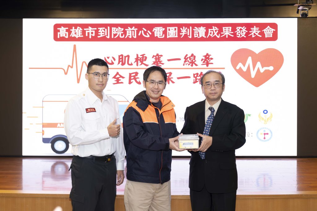 台灣心肌梗塞學會榮譽理事長 黃偉春醫師(右1),特別致贈高雄市消防局「高雄119守心藥盒」,象徵救護與醫療攜手合作,共同守護市民每一顆心臟。 (記者王正平翻攝)