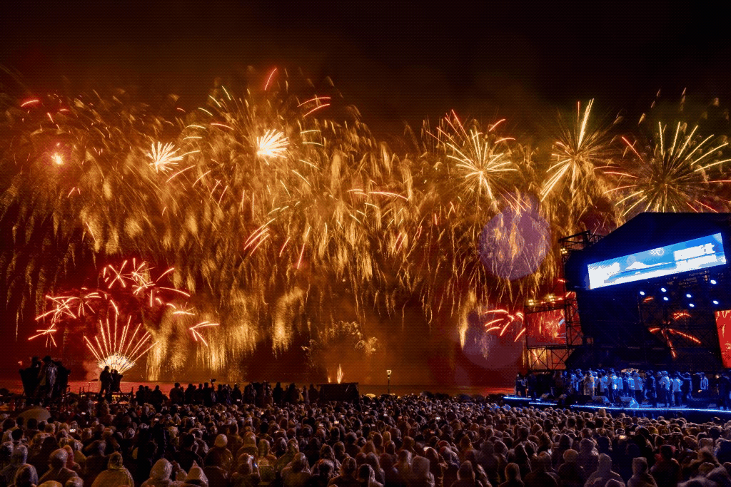 活動中,金曲歌王蕭煌奇攜手全方位樂團,以〈一定要成功〉凝聚現場能量,接續演唱〈好好先生〉、〈沒那麼簡單〉等膾炙人口的經典歌曲,溫暖歌聲引起全場共鳴。蕭煌奇更與淡水在地藝人李炳輝,同台合唱新歌〈輝煌旅行社〉及〈流浪到淡水〉,呼應跨河煙火舉辦地點「淡水星光舞台」,也讓音樂與土地情感緊密交織;壓軸登場的韓國人氣天后 HWASA,則以舞台魅力震撼全場,一現身便引爆觀眾歡呼聲。HWASA 帶來新歌〈Good Goodbye〉,低沉而富有張力的嗓音,搭配極具力量感的舞台演繹,魅力四射的國際級演出,現場尖叫聲不斷。
