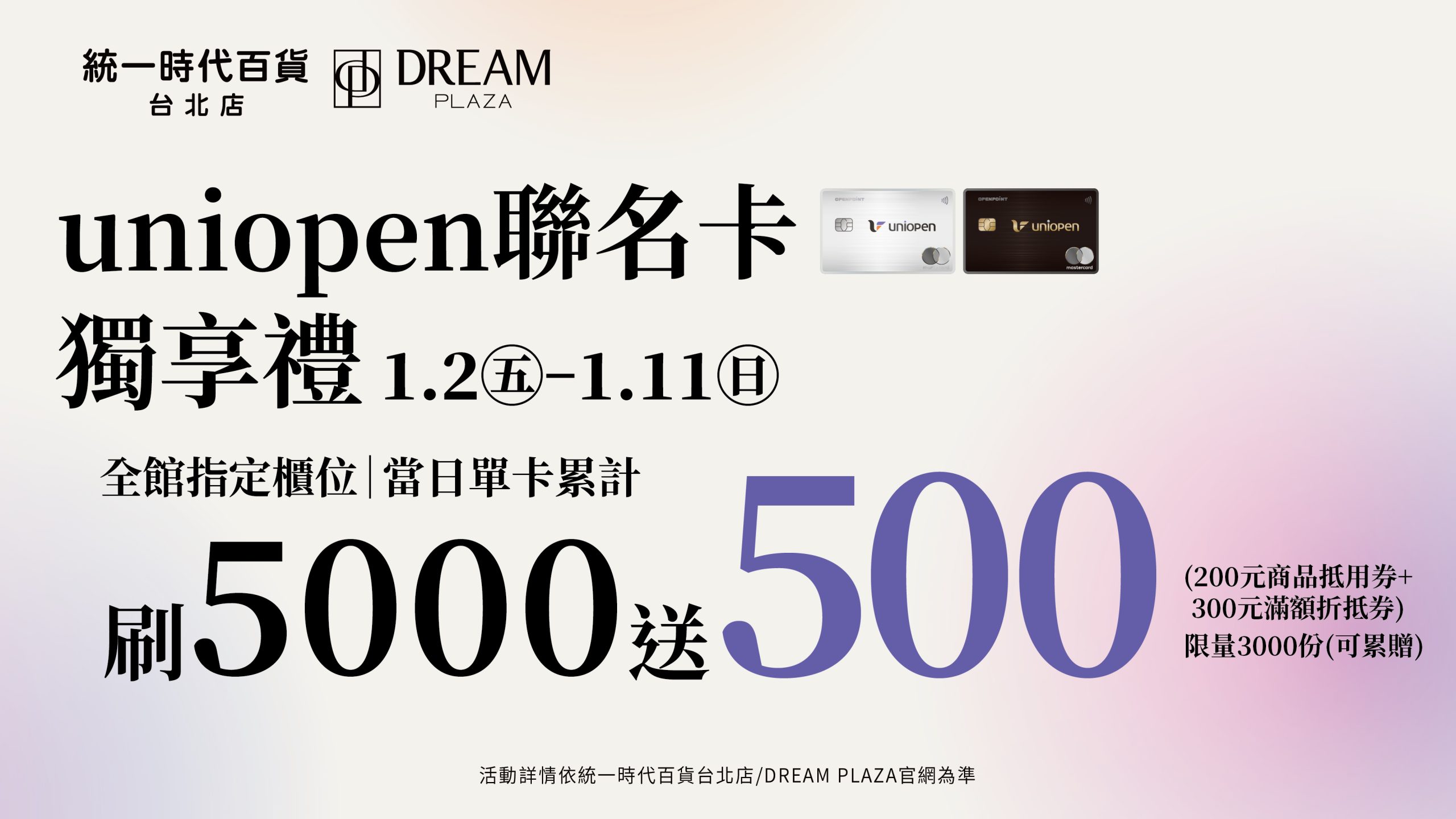 統一時代百貨|DREAM_PLAZA「OPEN_NEW_STYLE」01.02登場,刷uniopen聯名卡滿5000送500!