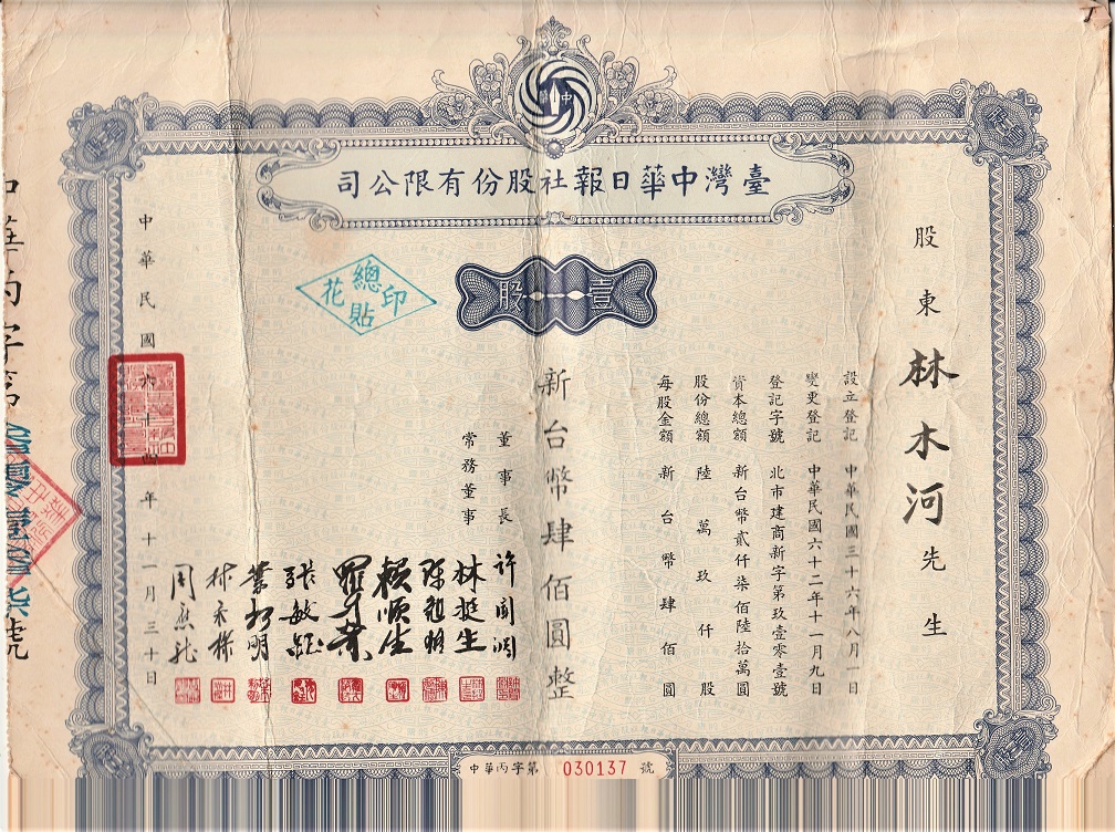 直到有一天,我在整理書房的舊物時,赫然發現,父親曾在我唸研究所時,要我代理他到「中華日報」參加股東大會,並已填妥移轉一張舊股票。印象中,只記得,父親是原始股東,早年曾出錢出力;但這件事竟因我忙於期中考而錯過了,直到多年後,才收到股東大會的來信,上面有我的名字。是的,父親留給我的,不只是一張舊股票或金錢所能衡量的,而是他用心栽培我們的勇氣,還有愛。