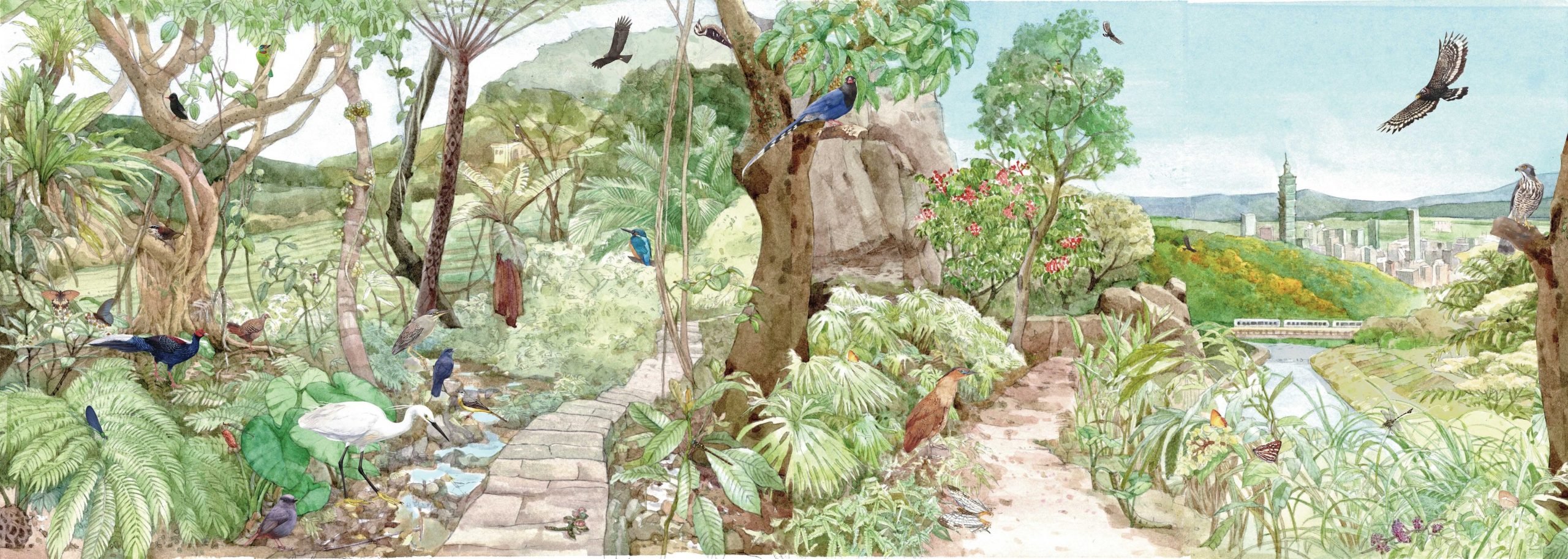 台北市大地工程處二日表示,生機盎然的淺山,環繞著高樓林立的台北城市,也串起人與自然的連結,進行生態調查已持續十年以上的時間,多年累積的調查成果,畫成一張充滿故事的台北淺山生態摺頁,準備邀請大小朋友一起來探險。