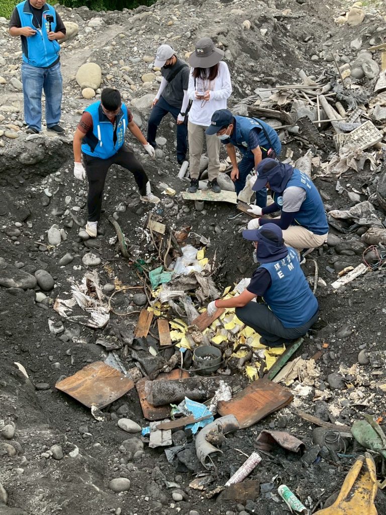 南投縣環保局於去年九月會同工務處、保七總隊第三大隊中區中隊、環境部環境管理署中區環境管理中心、經濟部水利署第四河川分署等跨域聯防單位,在臺中地檢署指揮行動下,破獲郭氏父子在臺中市西屯區非法經營廢棄物轉運站後,再長期載運廢棄物至中南部五縣市各河川地傾倒,環保局並利用科技儀器及調度重型機具針對轄內非法棄置地點協助專案小組進行開挖及蒐證,以利專案小組向上溯源及深入偵辦。