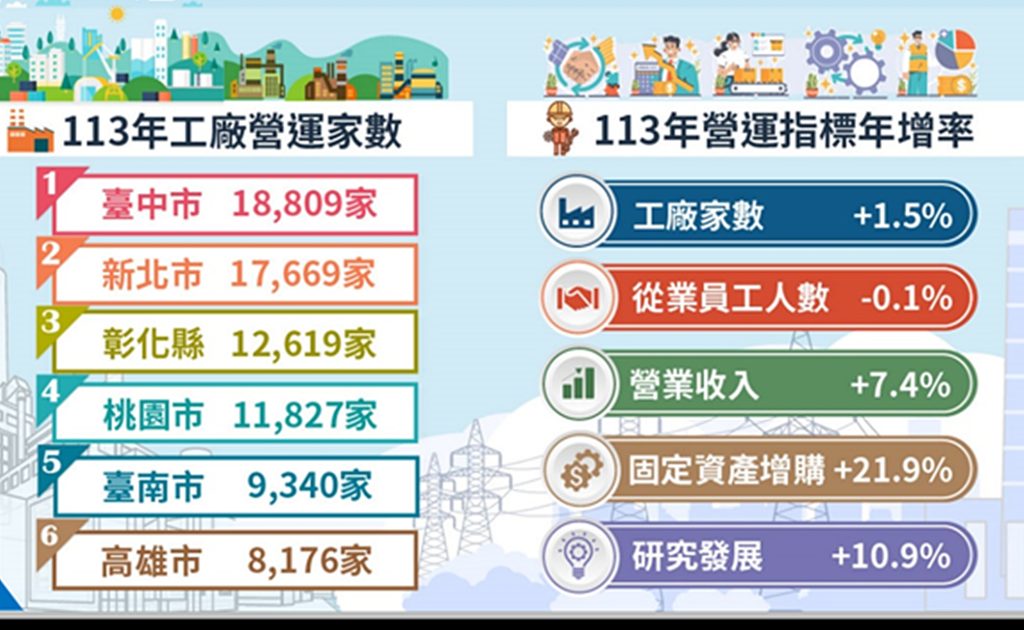 根據主辦單位經濟部統計處一一四年十二月中旬工廠校正及營運調查統計,桃園市一一三年工廠營業收入總額逾四兆四千五百八十九億元,較前一一二年的四兆零七百三十五億元,增加三千八百五十四億元,成長率將近 百分之九點五,大幅領先其他五都,顯示桃園市作為全台製造業基地的核心價值與市場競爭力。