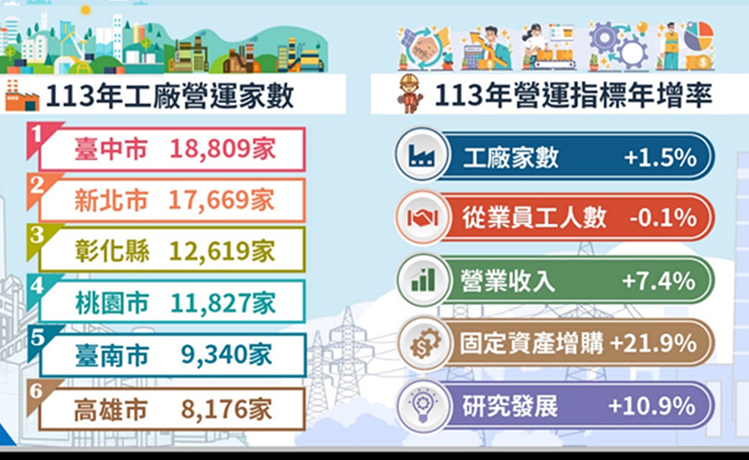 另在反映未來生產潛力的「當年固定資產增購金額」方面,桃園市一一三年投入高達二千六百八十四億元,相較於一一二年的二千三百九十四億元 ,增加了二百九十億元;在就業貢獻方面,一一三年底桃園市工廠員工總數達五十四點八萬人,高居全國首位,為全台家庭提供穩定的就業機會。