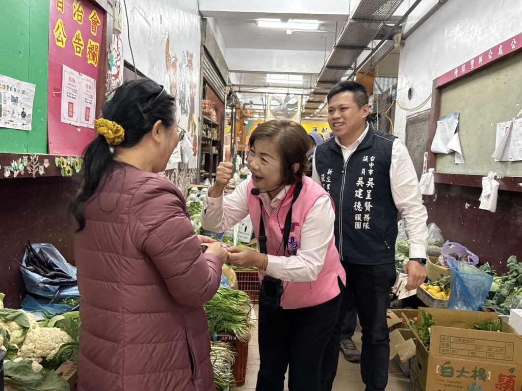 國民黨台中市長初選參選人楊瓊瓔,走訪清水市場、神岡菜市場及太平新光黃昏市場,向市民問候寒暄、傾聽基層心聲。(記者徐義雄攝)