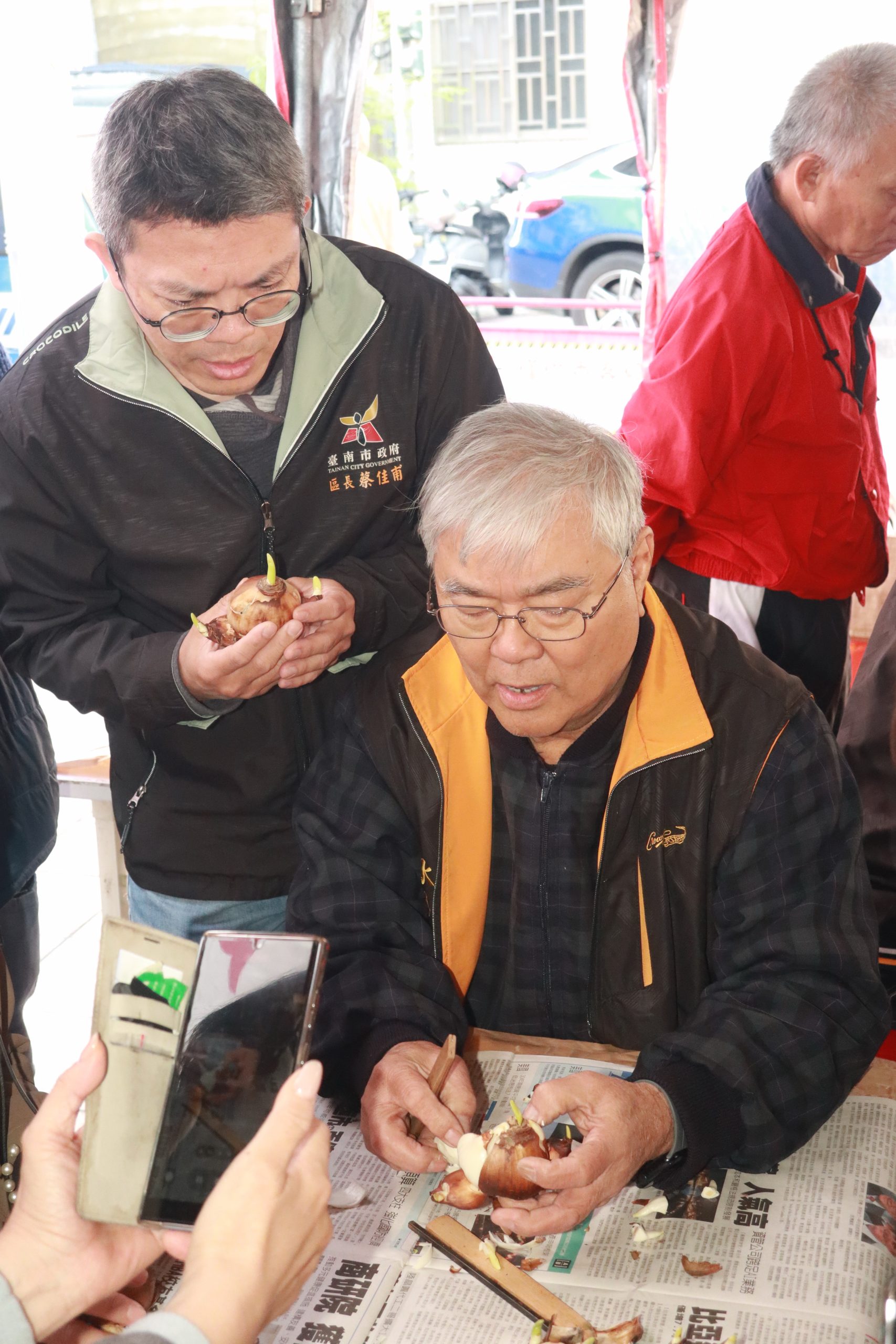 陳進明指導民眾雕刻水仙花的重點,球莖裡面有一個「生長點」必需切除,另外,雕完的水仙花只要一般自來水天天換水即可,不必用到RO逆滲透。最重要的是雙手摸完水仙花,要吃東西之前最好將手洗乾淨,因為它含有微量的「拉丁可」神經毒和植物鹼,雖然只是微量,但還是洗完手再吃東西會比較安心。