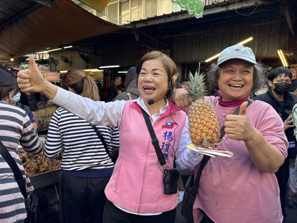 楊瓊瓔則前往屯區,先到大里區夏田里體驗拔蘿蔔「拔得頭籌」,向民眾送上祝福;接著轉往霧峰菜市場拜票,攤商致贈肉粽、菜頭、青蒜、鳳梨等,祝楊瓊瓔「包中」、氣勢長紅。之後到太平區中山菜市場,向攤商與民眾問候。