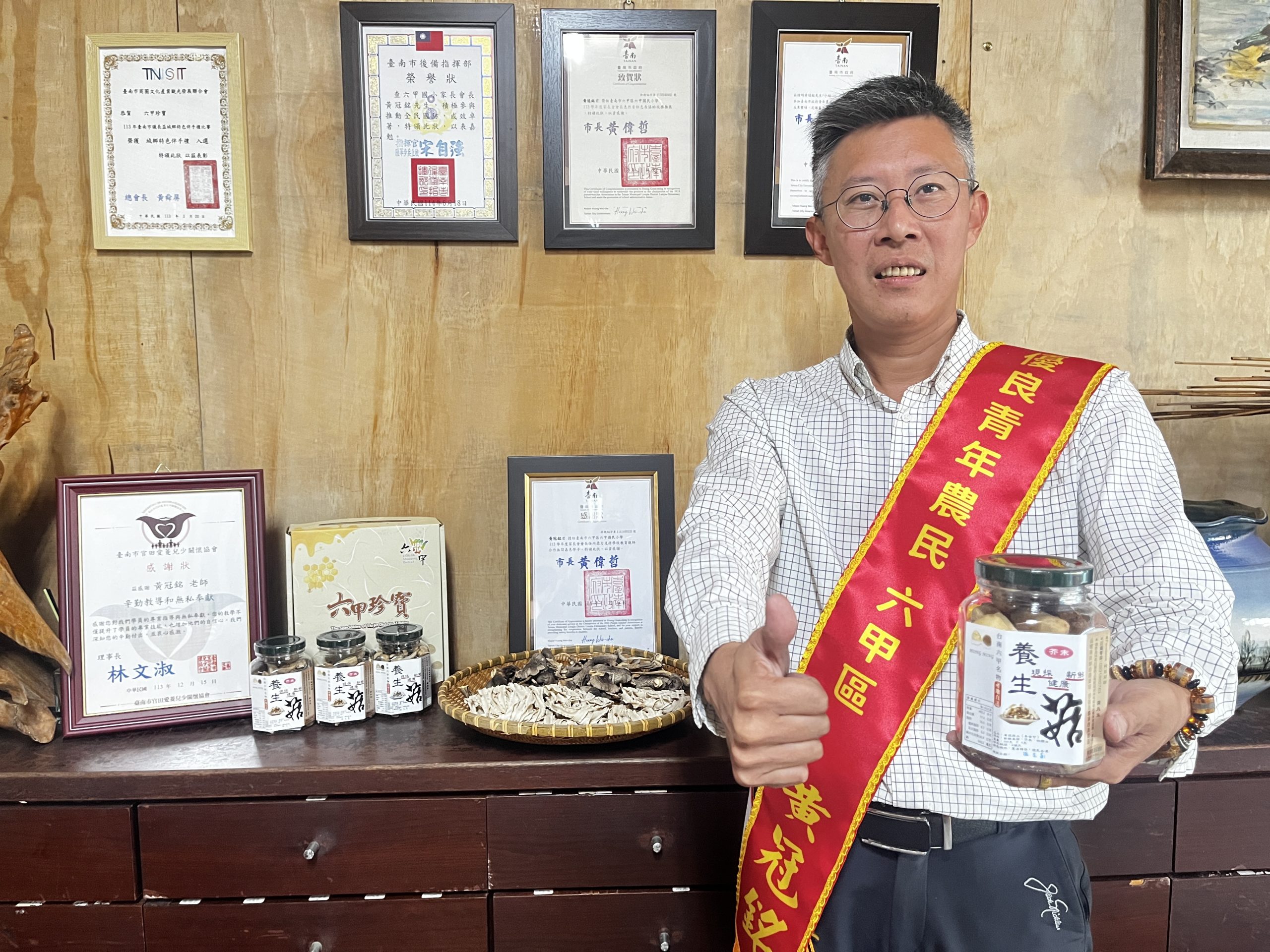 從事科技業的黃冠銘,因種菇的雙親年邁,十三年前回到六甲接掌家業,憑藉所學將菇寮改以科技管理,加上精美包裝及多元行銷,成功打開知名度,黃冠銘表示,早期六甲是全台外銷草菇第一名的地區,但隨著產業沒落,目前僅剩三、四人種菇,希望能再現昔日榮景。