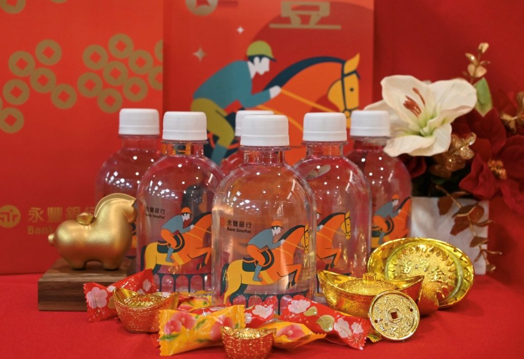 今(2026)年為丙午火馬年,永豐銀行表示,馬年四寶包含發財水、迎福春聯、聚寶袋與發財糖,蘊含祝福寓意。設計主軸環繞「騎士策馬」,以駿馬表現源源不絕的力量與無限生機,騎士則為智慧與勇敢的行動者,伴隨客戶精準掌握方向、馳騁未來;設計色調引用五行相生概念,以火元素為主調,結合代表「木生火」的綠青色,傳遞生長與蓬勃活力,佐以「火生土」的黃橘色,象徵穩健根基、收穫豐碩。整體視覺透過騎士策馬揚鞭、昂首奔馳,比喻福運相隨、事業高昇,展開充滿能量、財富永豐的新年。