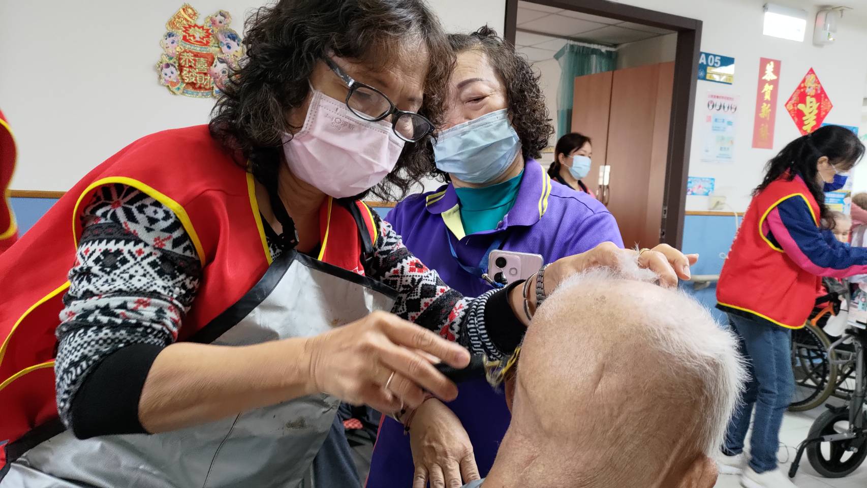 南市勞工局五日帶領台南市理燙髮美容業職業工會志工,前往南區新都養護所進行愛心義剪,透過專業服務、關懷長者送上祝福。