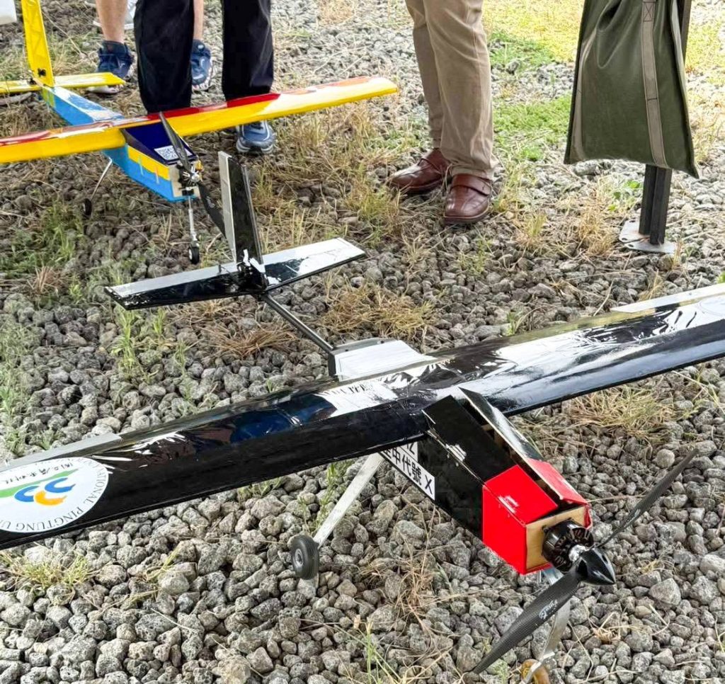 「空中代號X」定翼型無人機,由屏科大智慧機電學士學位學程教授徐子圭、副教授徐嘉偉及研究員張鴻彬共同指導吳宇翔等四名學生設計製作,該機翼展達二公尺,以夾板與巴沙木構建全機隔框及骨架,採用高翼穩定的前三點設計,兼具良好飛行穩定性與操作可靠度,同時具備可額外載重五公斤貨物的能力,並透過高升阻比與大推重比的優化設計,提升整體飛行性能與任務執行彈性,順利在「2025臺灣無人飛機創意設計競賽」獲得評審青睞。