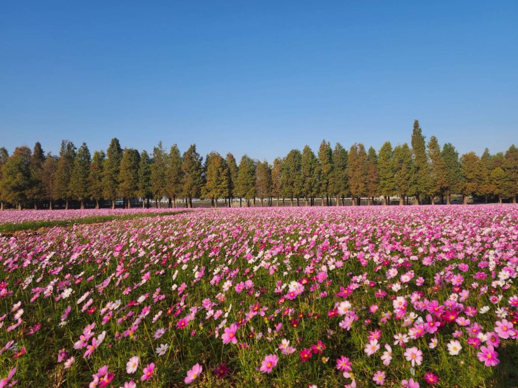 為了搭配落羽松浪漫美景,六甲區公所今年特別營造週邊花海景觀,面積二公頃種有波斯菊、紅蕎麥等各色花草,與落羽松林相互輝映。現正是花海盛開季節,吸引遊客前來賞花、拍照。