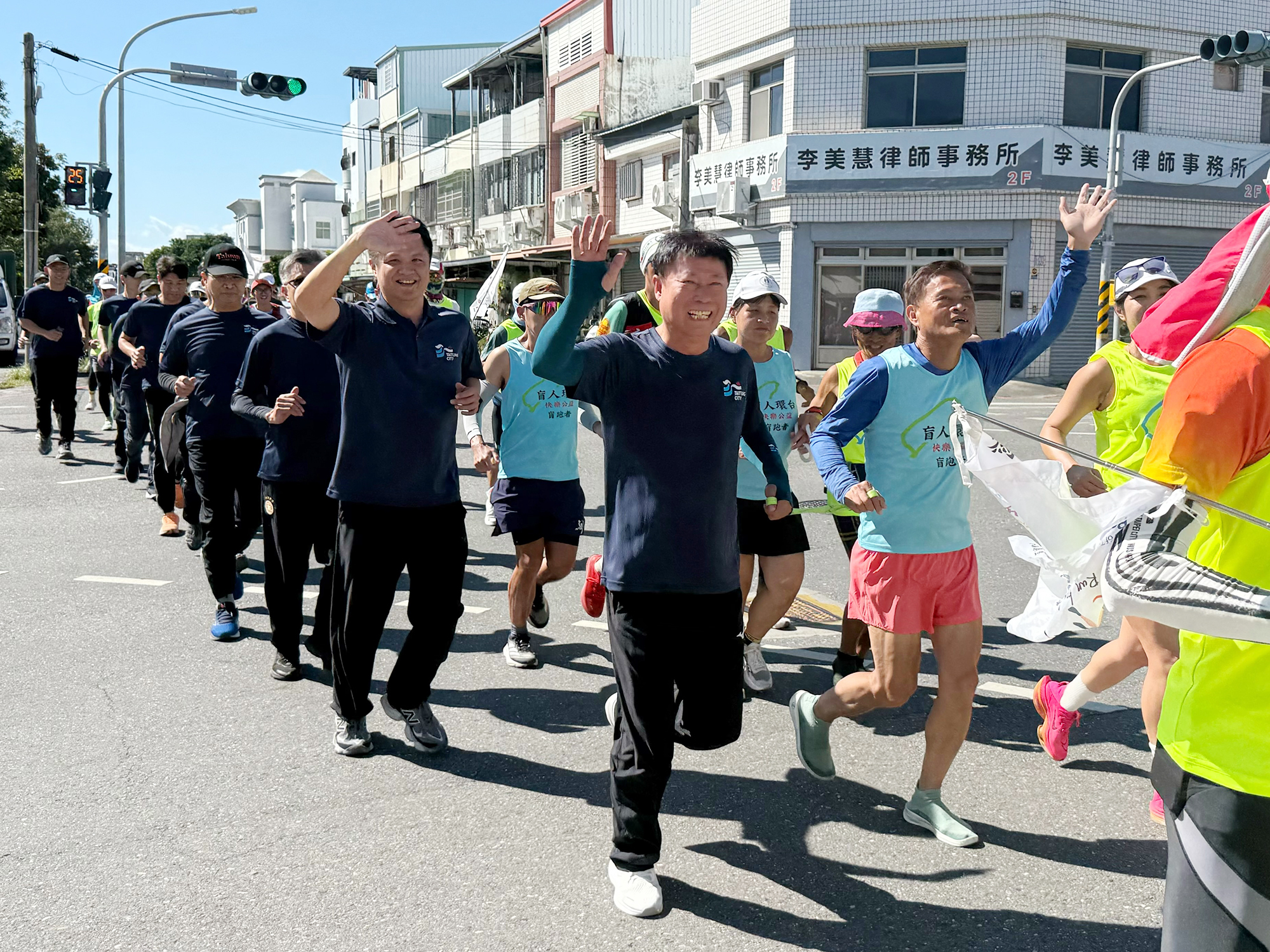 第九屆「盲人環台為公益而跑」,路跑隊伍五日來到台東市,活動也吸引國際跑者參與,展現跨國公益力量;市公所除提供補給,市長陳銘風也陪伴視障跑者,從市公所跑到馬亨亨大道,為公益行動加油打氣。