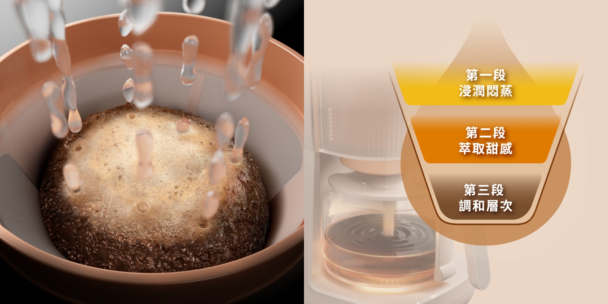 飛利浦手沖冷萃美式咖啡機有別於市售3段研磨設定,擁有高達 9 段的咖啡豆研磨選項,依據淺、中、深培豆特性,研磨出最佳粗細的咖啡粉,均勻顆粒釋放立體咖啡豆香。結合三刀流分段注水技術,模擬手沖繞圈沖煮手法,第一段注水浸潤悶煮咖啡粉,使粉末萃取均勻;第二段從中萃取甜感,口味更香濃;第三段調和層次,完美釋放咖啡豆最純粹的風味,幫你煮出最對味的咖啡!