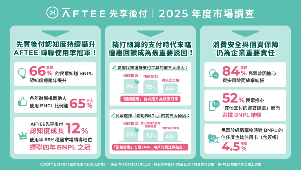 此外,台灣消費者對於「先買後付」的認知度持續攀升,知道BNPL的受訪者比例連續兩年提升達66.6%,且各年齡層受訪者推薦他人使用BNPL的比例皆達65%以上;AFTEE先享後付的認知度相較去年成長12%,以使用率66%蟬聯四年BNPL品牌之冠,穩居市場領導地位。