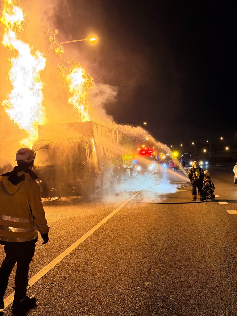 國道警察表示,於今(6)日凌晨接獲通報,國1北向43.7公里林口路段,有1部全聯結車起火燃燒,立即通報線上巡邏車前往查看,並通知119派消防車,警消迅速抵達現場,現場占用外側路肩及外側車道車道處理。
