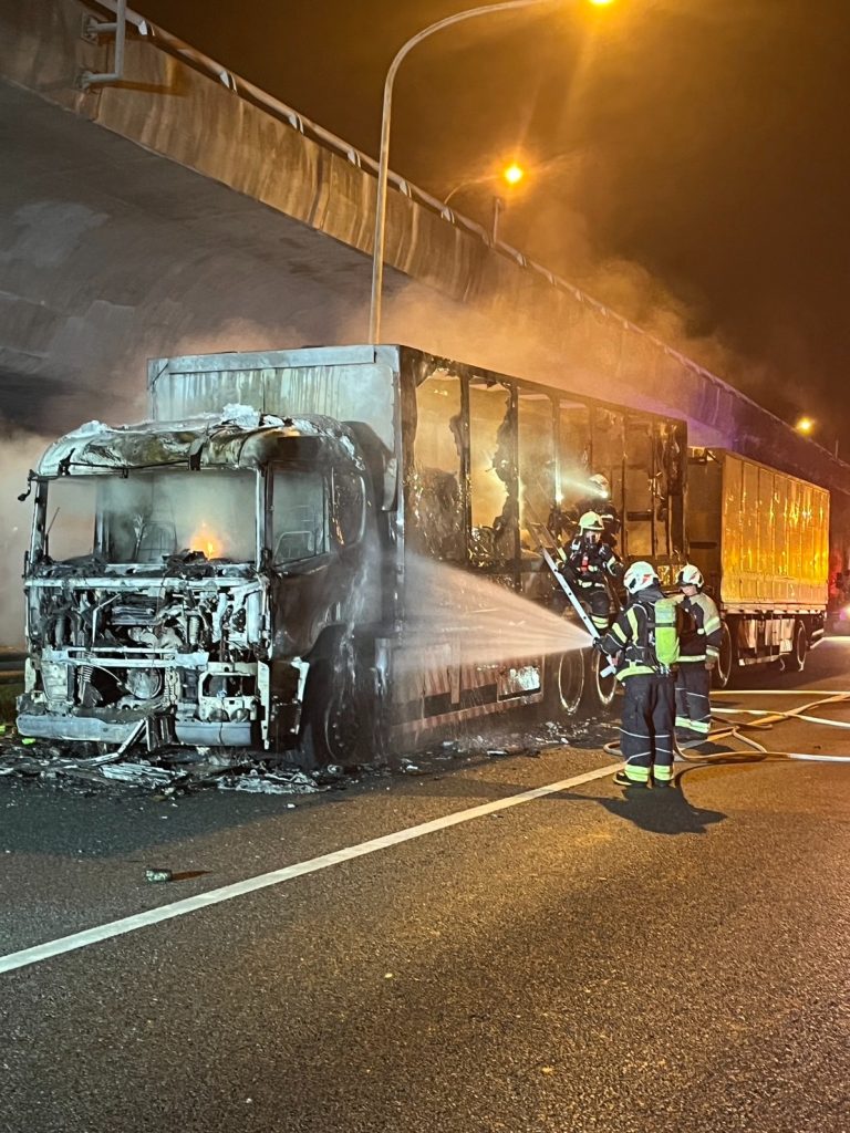 今(6)日凌晨1時2分許,46歲的林姓男子獨自駕駛全聯結車載運食品,行經國道1號北向43.7公里林口路段時,聽見引擎有異音,將車輛開往路肩停妥並下車查看,不料車輛隨即起火燃燒,警消獲報後立即趕到現場,所幸林男及時發現將車輛停下,並立即逃生,未受到傷害也未波及其他車輛,火勢於2時31分撲滅,現場於4時15分完全排除恢復通車,詳細的起火原因仍待消防進一步鑑識。