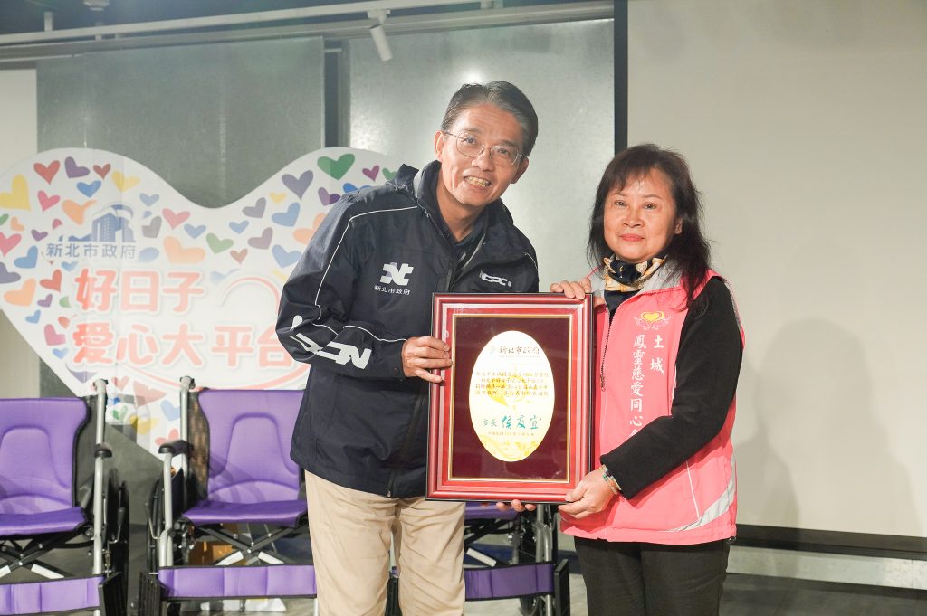 新北市府秘書長邱敬斌代表侯友宜市長受贈。他表示,感謝鳳靈慈愛同心會的發心和募集,以及所有歷年來響應的善心團體和企業,尤其是總督導蔡鵬飛,本身也是牙醫師,在板橋開設蔡牙醫,在他的人脈媒合下,從108年迄今總計捐贈了1,493台輪椅、245台助行器及1台氧氣製造機。
