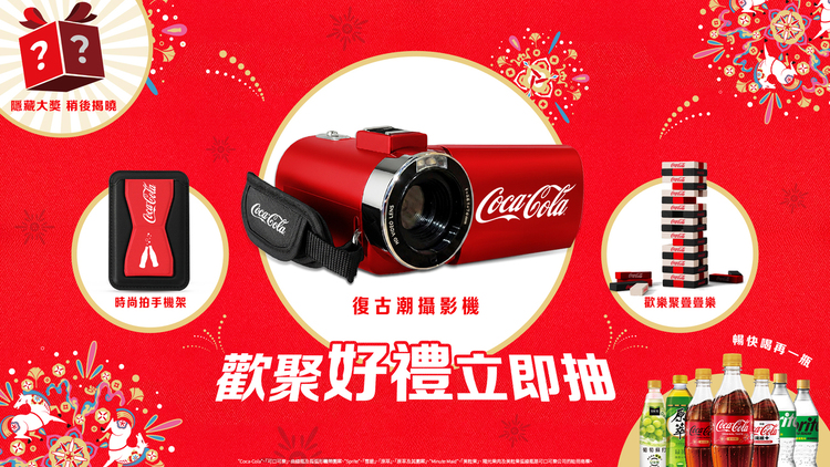 今年「可口可樂」也打造多款適合過年團聚時分享的限定周邊商品,包含「可口可樂」復古潮攝影機、「可口可樂」歡樂聚疊疊樂與「可口可樂」時尚拍手機架,並於2月14日(六)至2月28日(六)期間加碼推出期間限定追加獎,總獎項數量高達24,000份,中獎率超過 50 %,透過簡單且即時有感的參與方式,持續放送好運與歡笑。