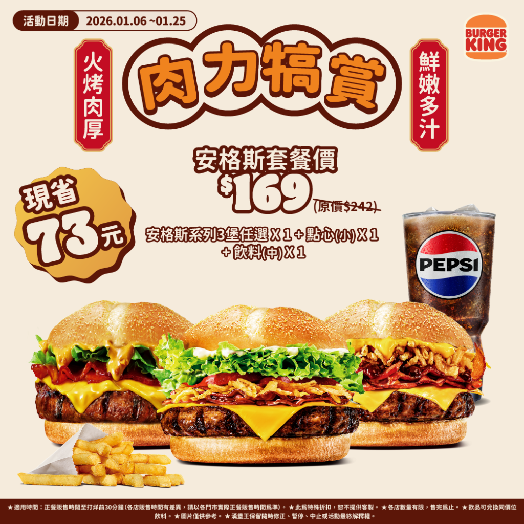 漢堡王新年拋兩大震撼優惠,即日起至25日將推出安格斯牛肉堡系列套餐限時169元好康價,讓柔嫩的安格斯厚切牛肉,在歲末年終犒賞自己,可足足現省73元;另外即日起至2月9日則有119元起的雙堡組合,共6款美味漢堡任消費者挑選搭配,滿足口腹之欲不怕傷荷包。
