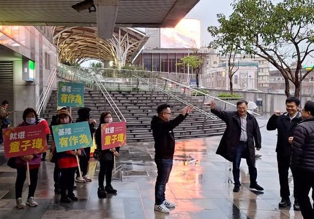 童子瑋甫獲提名,即馬不停蹄,六日清晨站在基隆火車站南站與鄉親問好,打招呼,有一位阿伯上前握手,當場預祝他議長變市長。