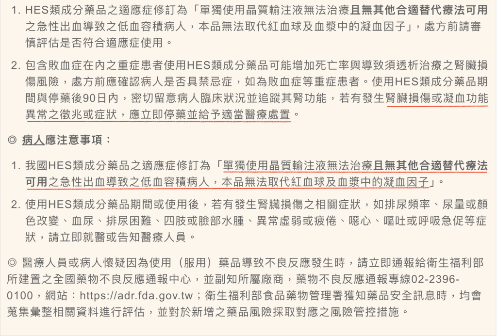 - 醫學臨床發現:HES藥物可能誘發嚴重的循環系統不良反應,歐盟甚至自113年起已全面禁用。食藥署也已對此藥物限縮其使用適應症。