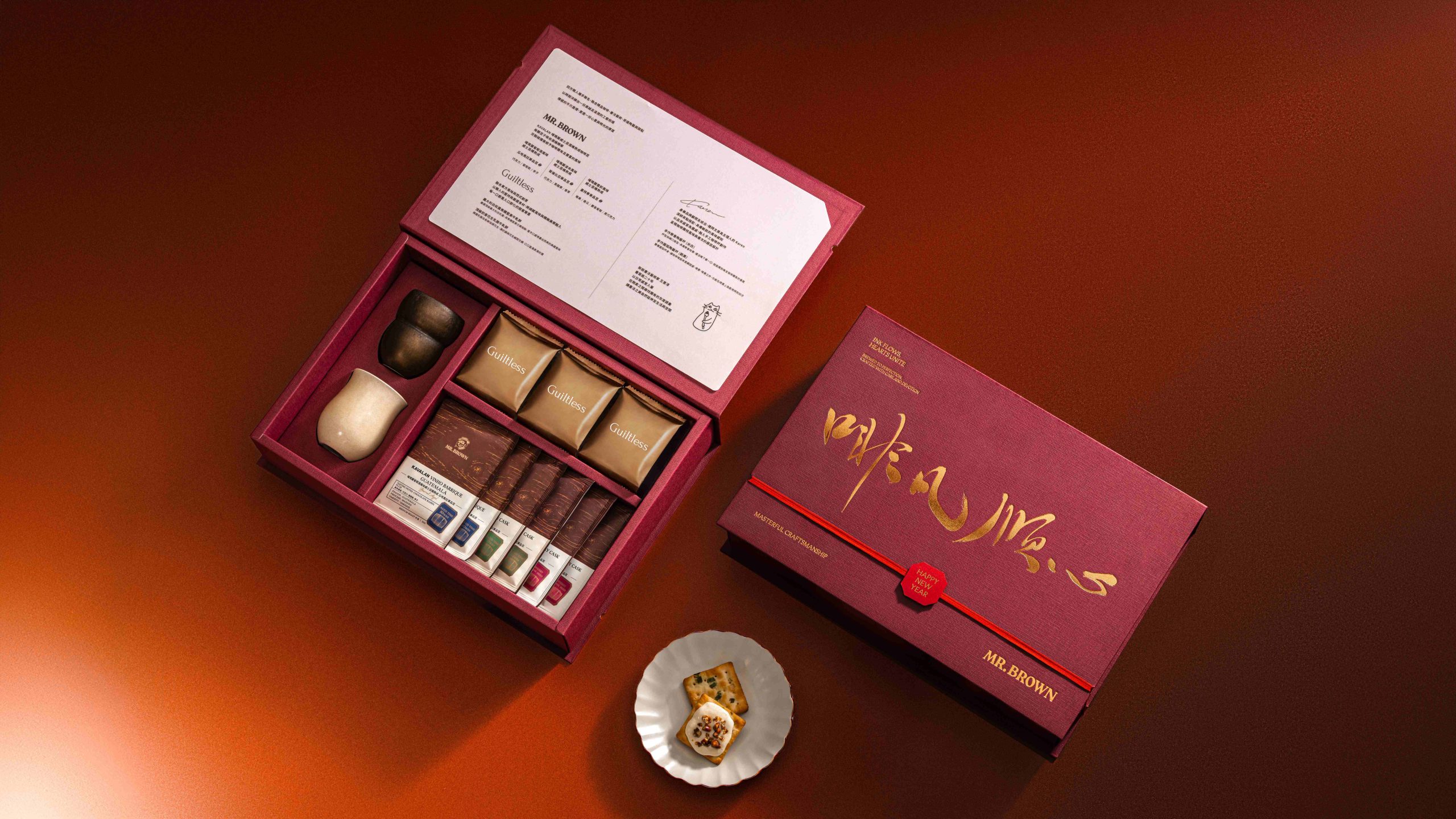 此次新春禮盒由伯朗咖啡館攜手新銳書法藝術家王意淳、甜點品牌Guiltless與琥泊茶苑四方共同打造,兩款禮盒包裝皆以王意淳手寫書法賀詞「啡凡順心」為設計主軸,將咖啡日常與新春祝福巧妙融合,傳遞溫潤而細膩的年節心意。禮盒內嚴選三款伯朗咖啡暢銷的噶瑪蘭威士忌桶陳濾掛咖啡,包括葡萄酒桶、波本桶、雪莉桶三種風味,分別使用瓜地馬拉、哥倫比亞、曼特寧單品咖啡豆吸收酒桶熟成精華,呈現層次豐富、尾韻圓潤的風味表現;搭配Guiltless為此次合作推出的春節限定牛軋餅,「義大利白松露焦糖堅果牛軋餅」以頂級白松露結合焦糖堅果,堆疊出輕奢香甜的口感層次,而「頂級奶香花生乳酪牛軋餅」則融合東方年節意象與西式甜點創意,以鹹甜交織的滋味象徵「好事發生」,搭配充滿酒香的咖啡,打造出最適合春節分享的味蕾組合。