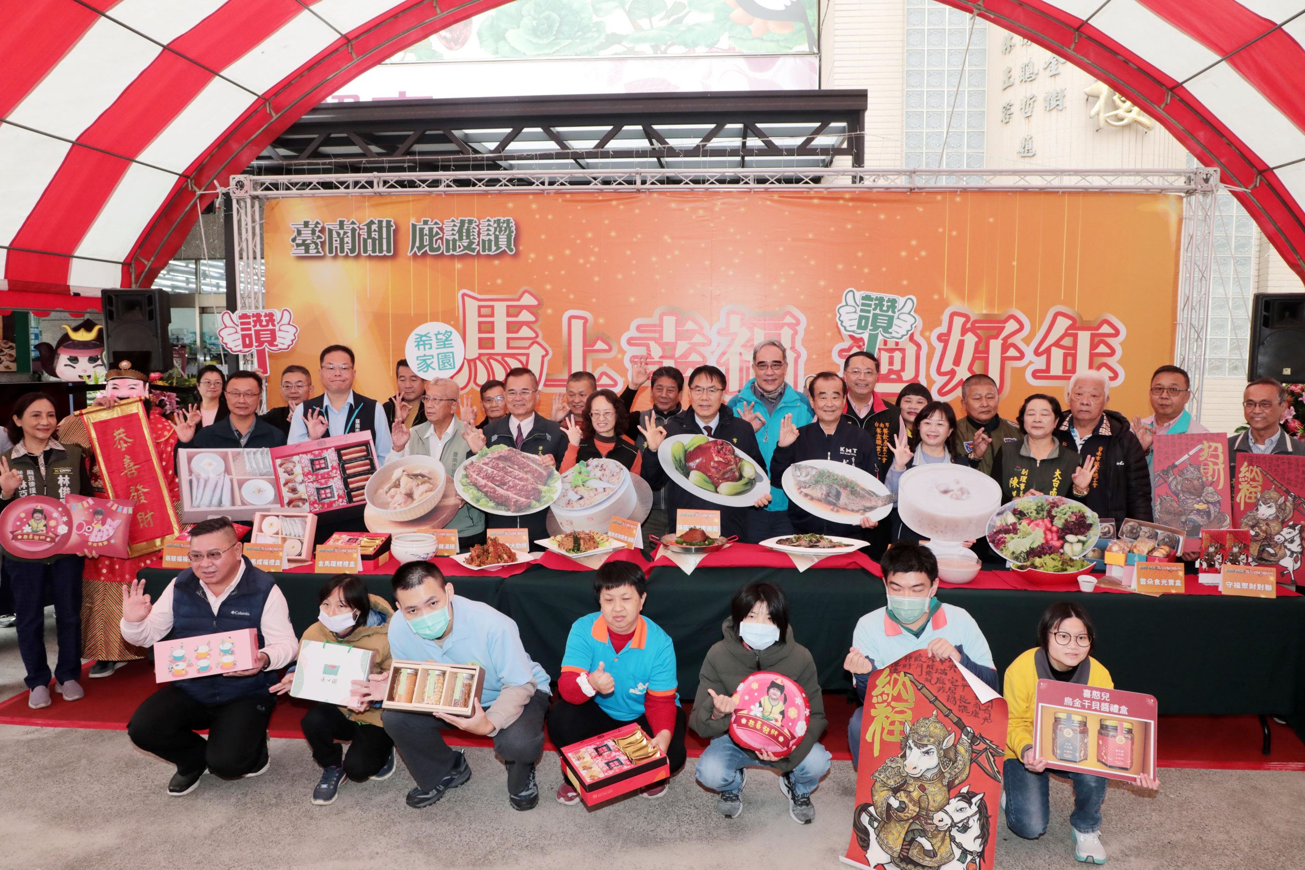 台南市政府勞工局七日在官田區農會超市前廣場辦理「馬上幸福過好年─台南庇護年節禮」行銷記者會,攜手七家庇護工場推出多款精美年節禮盒與開運年菜。市長黃偉哲、勞動部勞動力發展署雲嘉南分署副分署長許慧香及五大總工會代表均出席,呼籲社會大眾共同守護弱勢就業,以實際行動訂購支持,傳遞溫暖與愛。