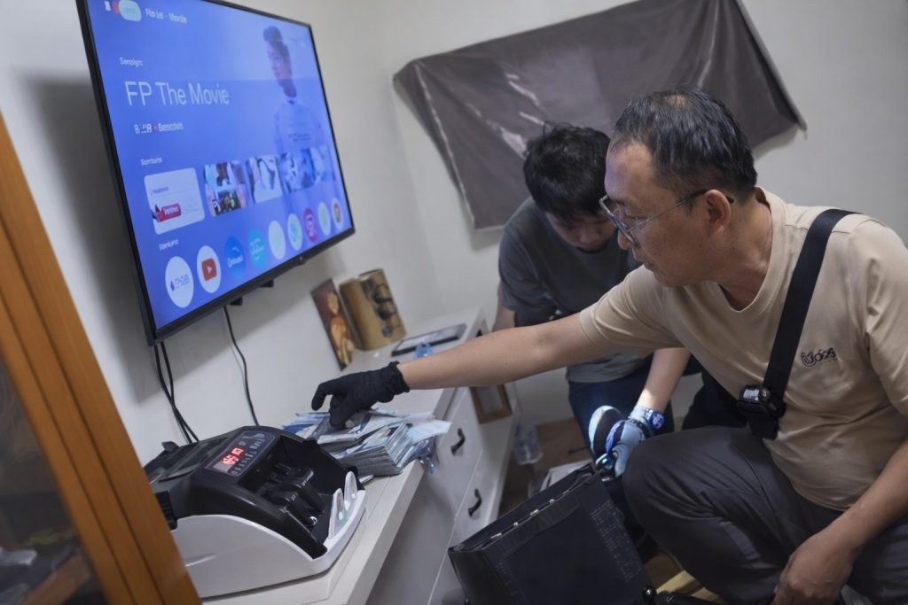 警方專案小組於周嫌住處及租屋處查扣點鈔機1臺、現金164萬1000元、手機1支、監視器主機1組,並起出愷他命毛重11.3公克、毒品咖啡包毛重33.6公克(牛B圖樣)、電子磅秤及K盤等多項相關證物。