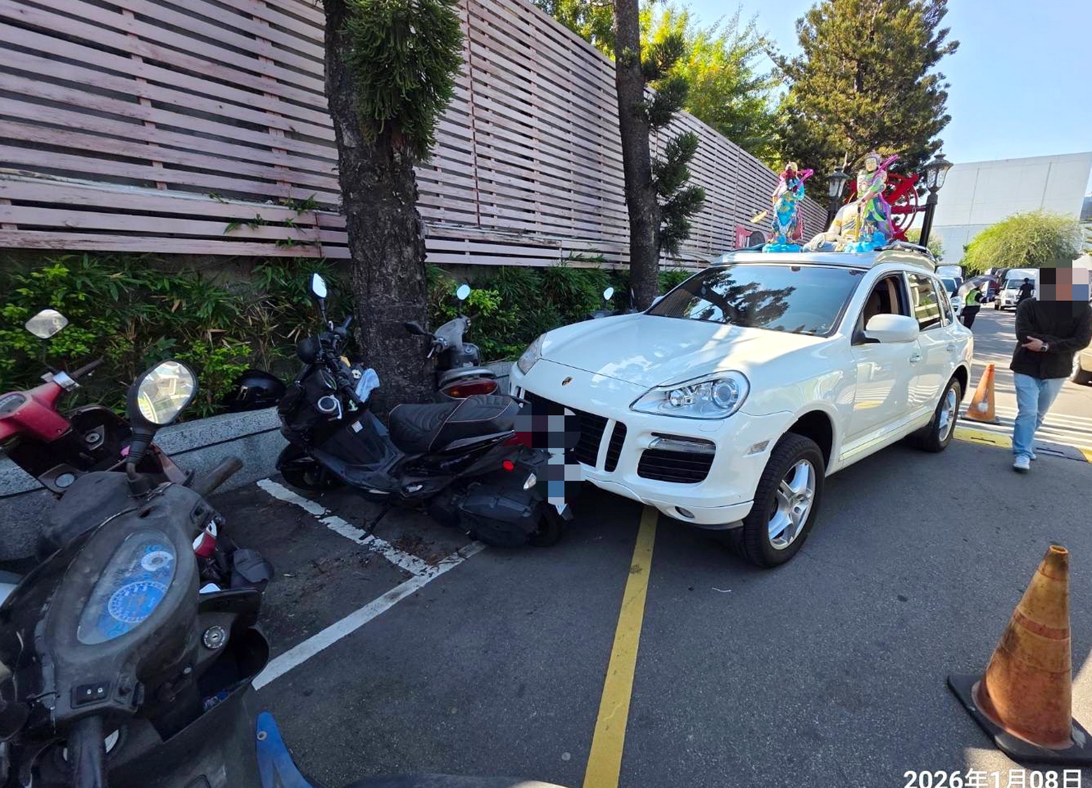 該輛保時捷因向前滑行,撞到一旁的石姓、羅姓女子及楊姓男子,一共三名行人受傷,又波及停在路邊的六輛機車。消防到場處理,經查石女多處擦挫傷、羅女手腳擦挫傷,楊男腹部不適但無明顯外傷,三人均意識清楚,所幸無生命危險,石女送醫治療,其餘傷者留在現場處理後續事宜。