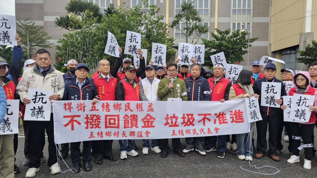 近五十位五結村民高舉「不撥回饋金、垃圾不進廠」布條,鄉長沈德茂、議員簡松樹、鄉代會主席林證梧等到場聲援。地方要求在回饋金解凍前,除五結鄉外,縣內其他十一鄉鎮市垃圾車一律暫緩進廠。