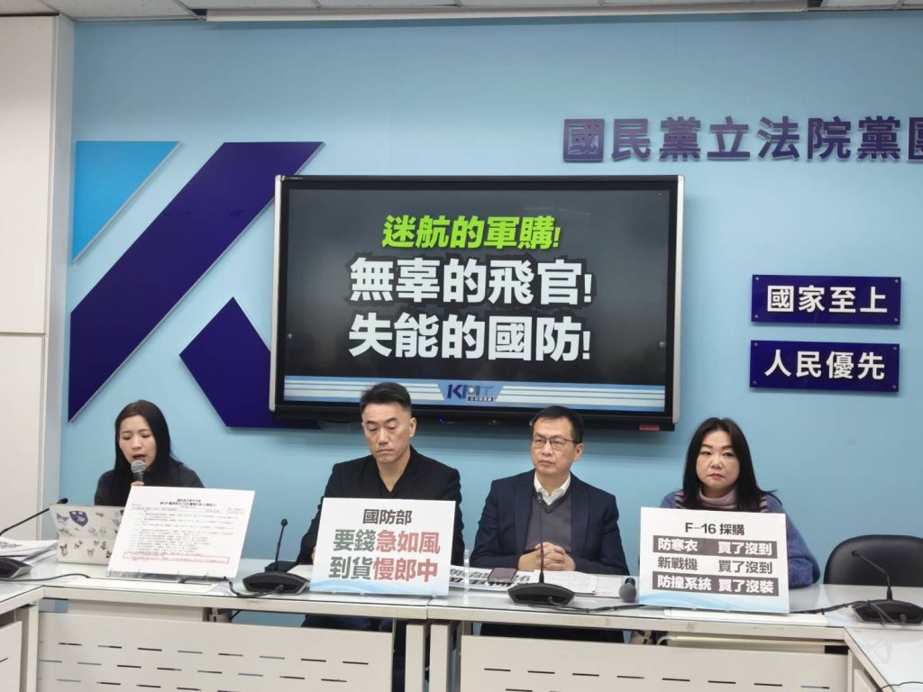 國民黨立院黨團八日召開「迷航的軍購!無辜的飛官!失能的國防!」記者會,黨中央亦同步透過臉書發文,從政策執行與制度治理兩個層面,質疑相關軍購與安全裝備長期延宕,要求民進黨政府正視飛安與國防治理問題。