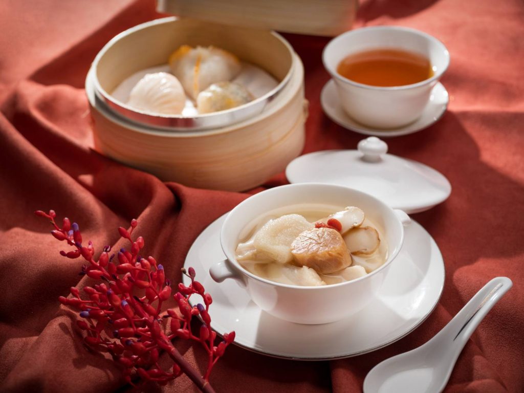 「雅閣」2月17日至2月22日,初一至初六,推出多款新春賀年美饌,以兩款新春豪華套餐最為吸睛,其中「花開富貴賀年套餐」網羅8道年節佳餚,包括「生意大鴻圖」雅閣叉燒皇.八珍陳醋和牛面頰.手拍小黃瓜白玉耳.陳醋海蜇頭、「歡喜慶團圓」筍尖鮮蝦餃.松露蛋白蟹肉餃.羊肚菌竹笙水晶球、「財源滾滾進」松茸竹笙燉瑤柱、「吉星永高照」X.O.醬如意龍蝦球、「新年新氣象」蒜片和牛牛柳粒、「好運旺旺來」蒜子蟲草花浸時蔬、「金玉福滿堂」臘味糯米飯、「步步齊高升」遠年陳皮湘蓮紅豆沙.金箔椰香棗皇糕等,每人4688元起+10%。