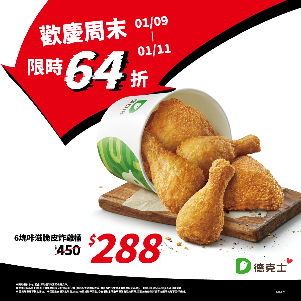 連續低溫特報來襲,脆皮炸雞專家—德克士為替寒冷週末加溫,於 1 月 9 日星期五至 1 月 11 日 星期日推出「歡慶週末」限時優惠,主打高人氣6塊咔滋脆皮炸雞桶,整桶通通都是腿,包含 雞腿排與棒棒腿 精華部位,並嚴選 台灣本土雞 製作,原價 450 元,活動期間特價只要 288 元,等同直接下殺 64 折,成為寒冷週末最暖心的炸雞選擇。